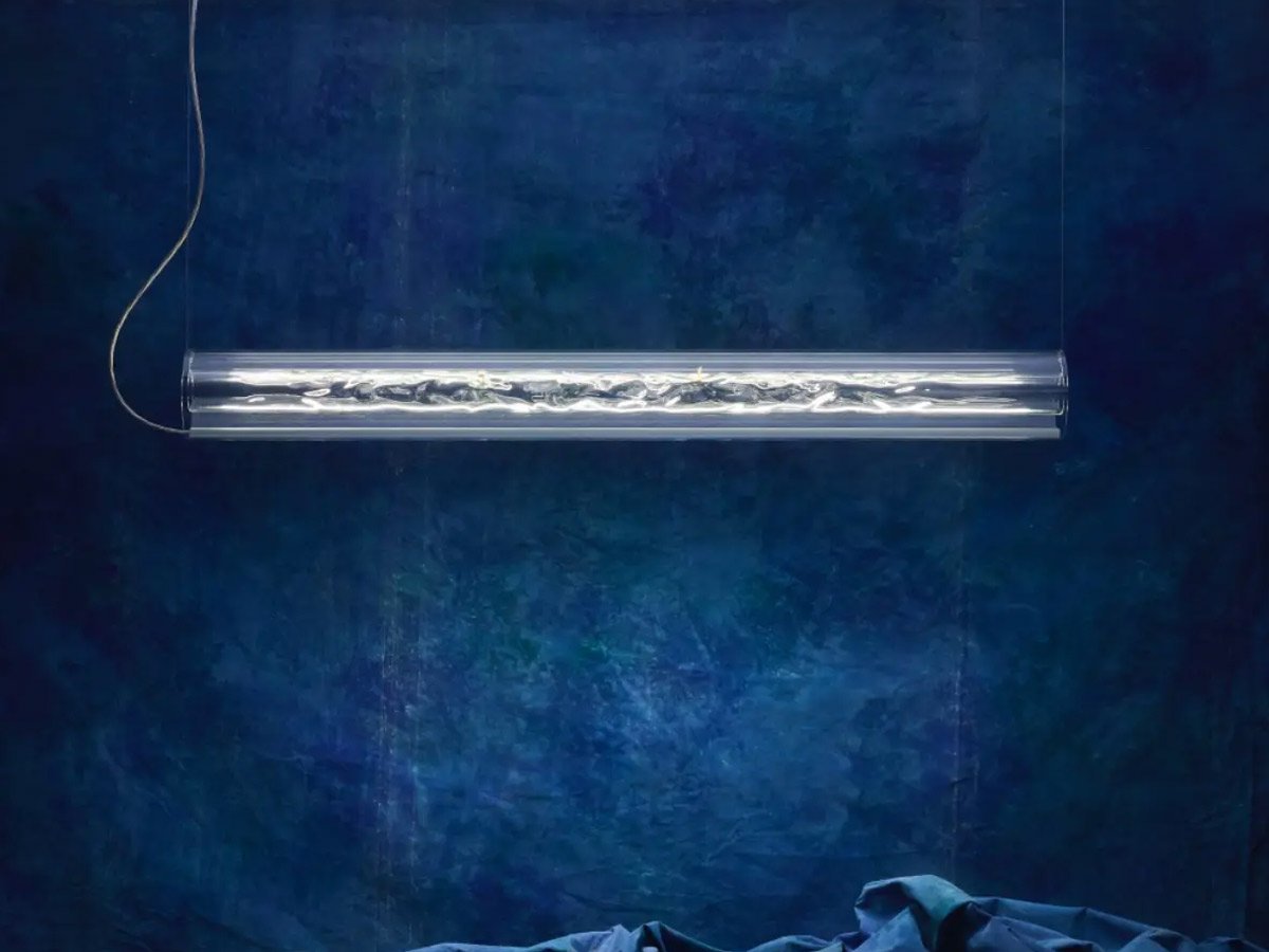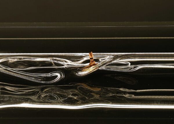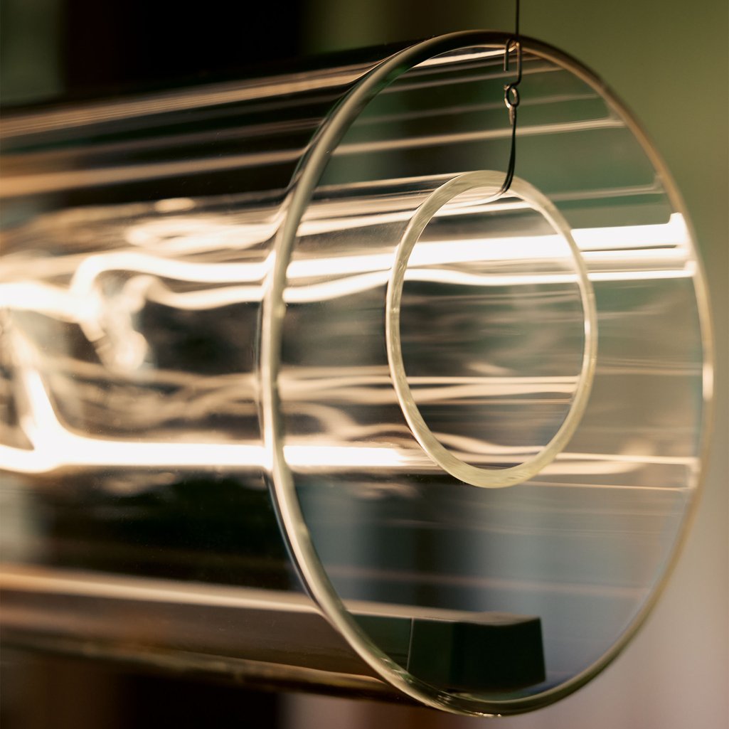 NALUM lädt zum Experimentieren mit Licht und Schatten ein: Das handgefertigte innere Glasrohr kann bewegt werden und ermöglicht stets neue Lichtformationen. Als spielerisches Detail dienen die beigefügten Figuren eines Surfers und einer Surferin, die auf den Wellen des inneren Glasrohrs platziert werden können. Die filigrane Seilaufhängung, die sich längs durch die Leuchte zieht, verstärkt die schwebende Anmutung der Leuchte und ermöglicht eine präzise Lichtausrichtung.